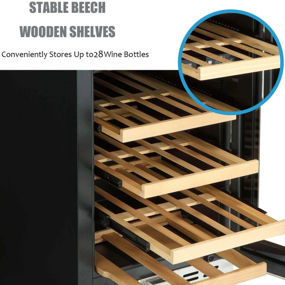 - 📏 Compact Design, Big Capacity at just 14.9" wide, it fits under cramped kitchen counters or studio apartment corners while holding 28 bottles (750ml) and 48 beverage cans. Reversible door hinge and front vents allow flexible placement without overheating risks.